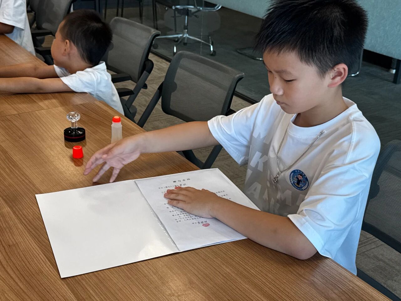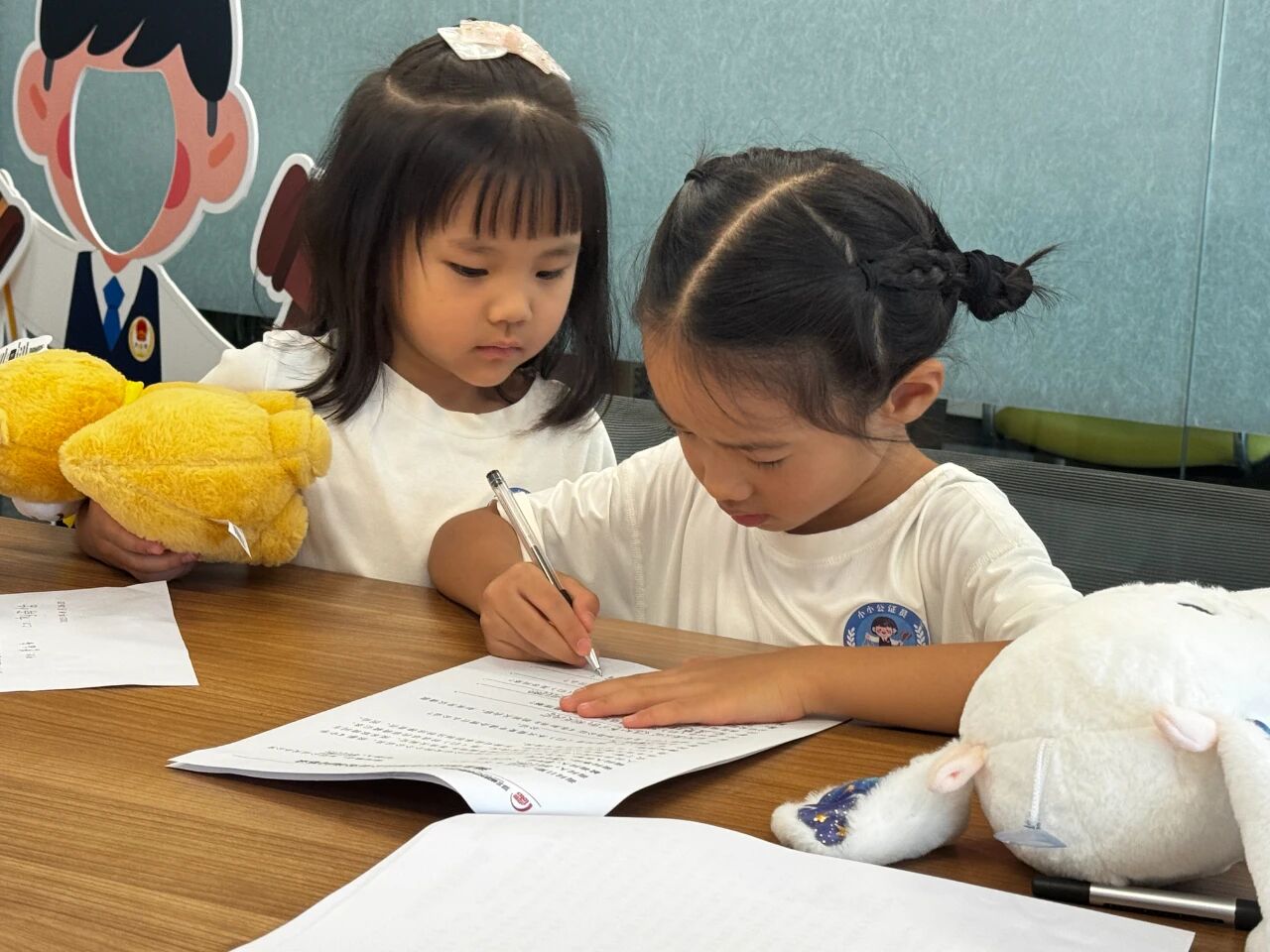 在互动环节,孩子们写下“心愿单”,列举了自己想和和父母一起完成的事情,例如:“周末一起去游乐园”“晚上一块儿看电影”“完成一次亲子手工”……小小公证员们在郑重地询问了承诺人真实意愿后,为其写下的承诺书办理了签名属实公证,最后在“公证书”上签名并盖上了专属“小小公证员”印章,出具了公证书。这个环节不仅让孩子们在体验中理解了承诺与契约的分量,也让他们体会到公证在保障信任、守护亲情中的独特价值,进一步彰显了公证制度服务社会、传递诚信的意义。