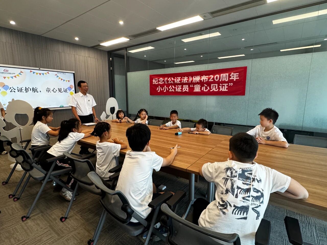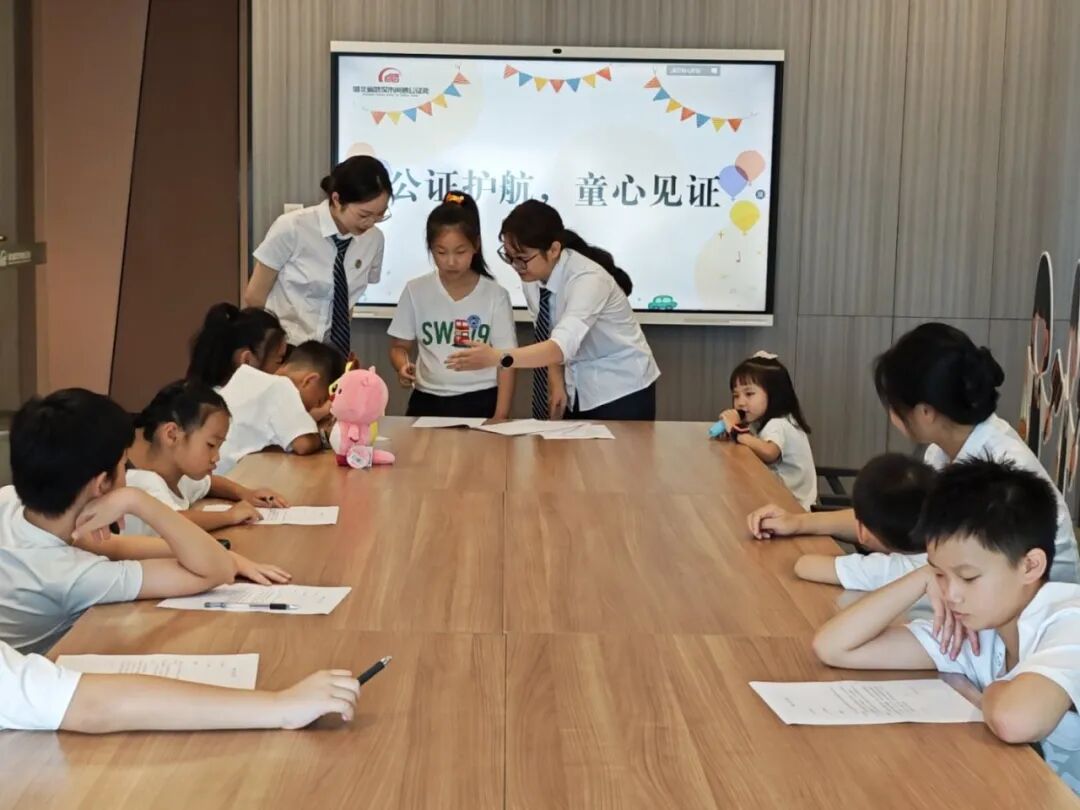 伴随着欢声笑语,小朋友们了走进尚信公证处,工作人员带领孩子们参观了办公环境,揭开了公证处神秘的面纱。随后,“公证法小课堂”生动开讲,公证员刘俊佚通过视频、动画和小册子串起二十年来的公证故事,孩子们听得聚精会神,不时发出好奇的追问,父母的职业在孩子眼中变得鲜活而具体。
