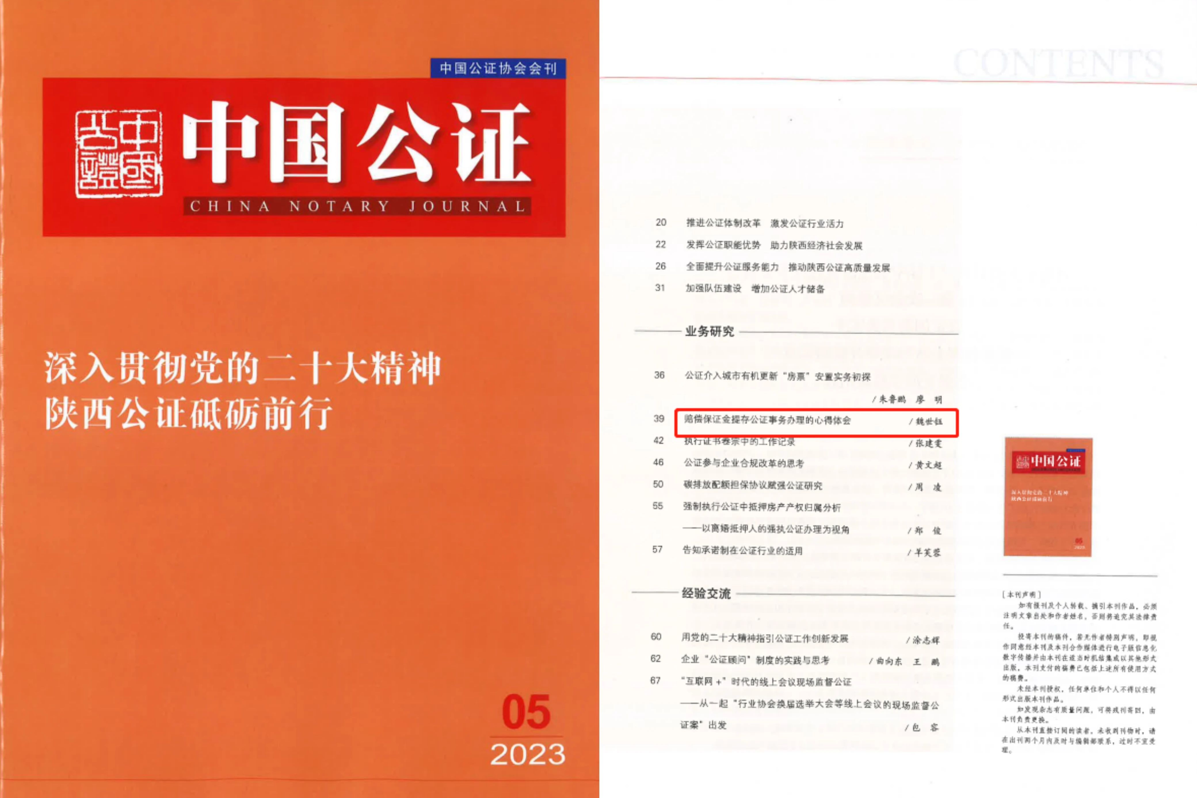 近日,湖北省武汉市尚信公证处公证员魏世钰撰写的《赔偿保证金提存公证事务办理的心得体会》在《中国公证》杂志2023年第5期刊登。