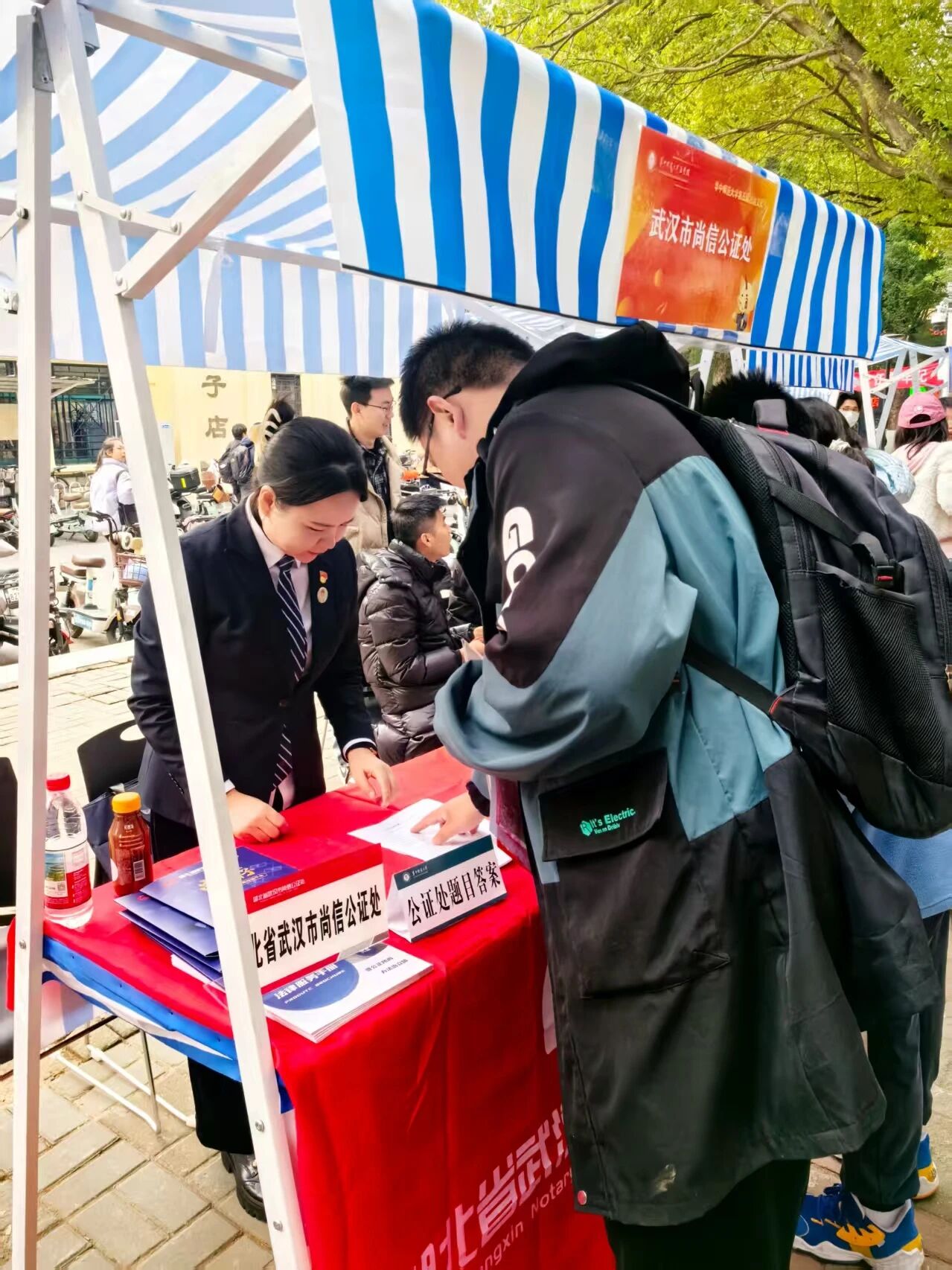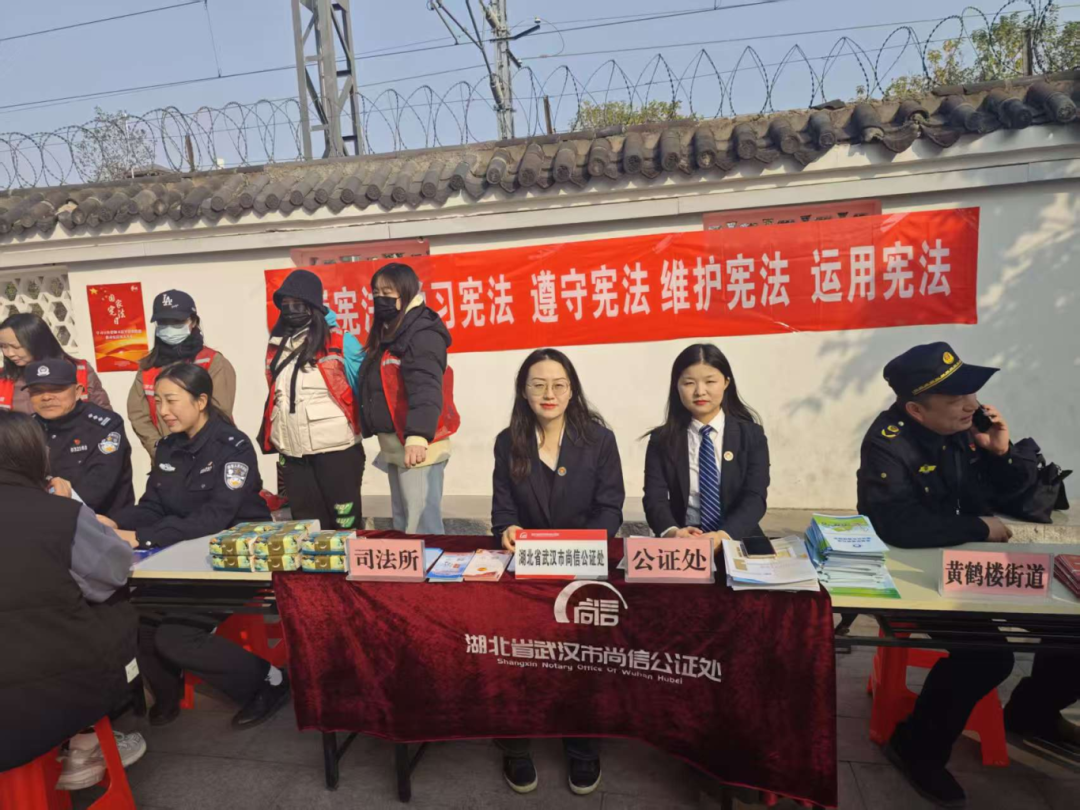 12 月 4 日上午,尚信公证处联合黄鹤楼派出所、街道办、司法所,在黄鹤楼公园西门开展普法宣传。针对游客和市民关心的遗嘱继承、房产委托、涉外公证、家庭财产约定等热点问题,公证员邹方园、韩爽提供 “一对一” 咨询,用通俗语言拆解法律条文。