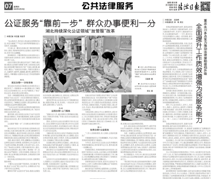 2022年起,我所在的武汉市尚信公证处与街道、社区开展深度合作,在全市率先推出“社区公证员”制度,将公证窗口前移,把公证法律服务真正搬到家门口,为企业和群众提供“零距离”的综合法律服务。